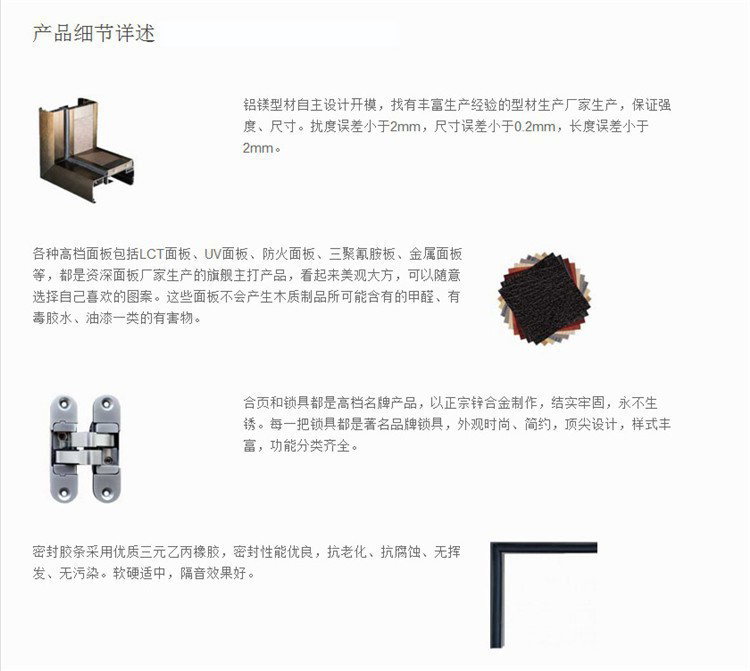 合頁: 不銹鋼及進口超高分子材料精制而成,結構緊密,開合無聲(天地合頁、字母合頁、隱形合頁)。門鎖: 鋁鎂鈦合金壓鑄而成,款式新穎,時尚,堅固耐用。 |